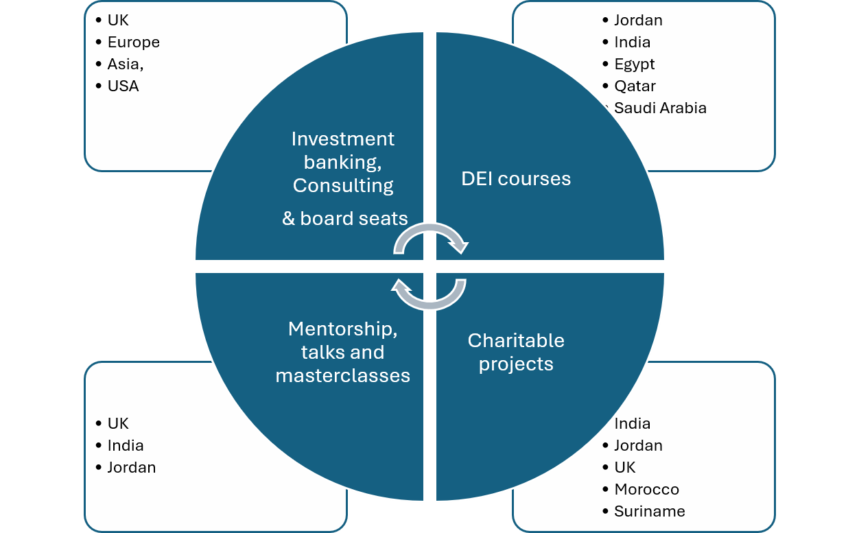 I am on the board of a Trust and have been running a programme for the mentoring of women entrepreneurs in rural areas in India which is also being taken to other countries. I have also have designed and instruct a course on DEI and sustainable change for universities in Jordan.